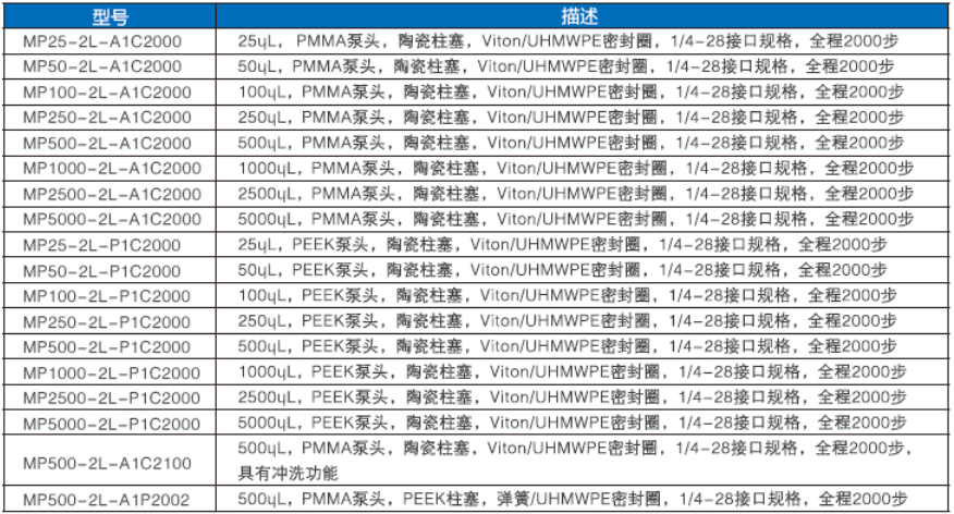 提供多種泵頭材質(zhì)(PMMA/PEEK/PEI及其它)、多種柱塞材質(zhì)(陶瓷/PEEK及其它),多種密封圈材質(zhì)(UHMWPE/Viton/FFKM/302ss及其它)。針對不同屬性的溶液選擇適合的材質(zhì),可延長泵的使用壽命,降低設(shè)備維護(hù)成本。