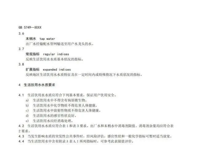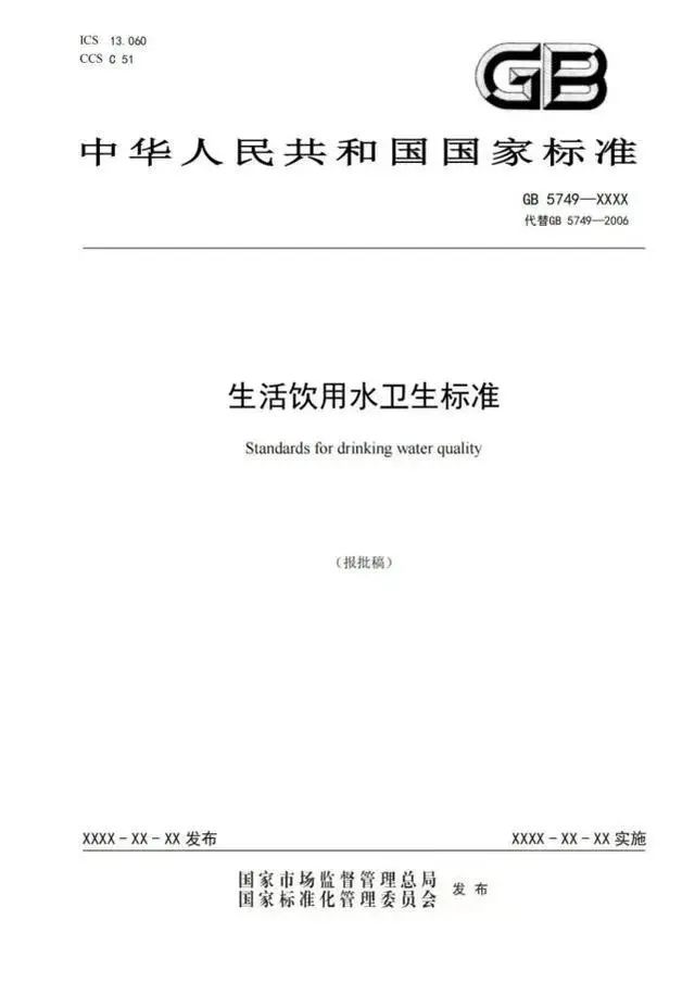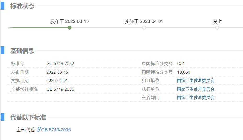 其中《生活飲用水衛(wèi)生標(biāo)準(zhǔn)》(GB 5749-2022)由國家衛(wèi)生健康委員會歸口上報及執(zhí)行,主管部門為國家衛(wèi)生健康委員會,將全部代替現(xiàn)行的 GB5749-2006,于 2023年4月1日 開始實施。目前,全國標(biāo)準(zhǔn)信息公共服務(wù)平臺暫未正式發(fā)布標(biāo)準(zhǔn)全文,預(yù)計于4月上旬公布(發(fā)布后20個工作日內(nèi))。