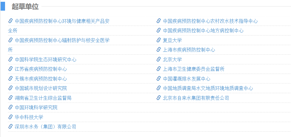 GB 5749-2006起草單位主要為中國疾病預(yù)防控制中心環(huán)境與健康相關(guān)產(chǎn)品安全所、浙江省衛(wèi)生監(jiān)督所、廣東省衛(wèi)生監(jiān)督所等。