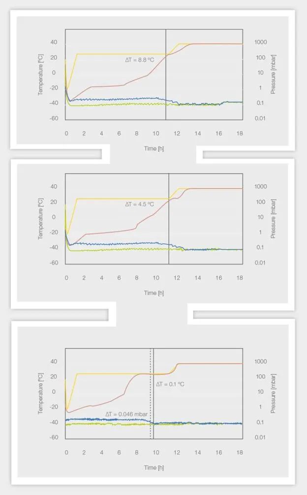 上圖所示為壓差為 0.05 mbar 的結(jié)果,中間圖為 0.03 mbar,底圖為 0.025 mbar 作為終點標準。在達到終點標準之前,壓差至少保持 60 分鐘。隔板溫度用黃線表示,樣品溫度用紅線表示,干燥箱壓力用綠線表示,皮拉尼壓力計在初級干燥(白色陰影)和二級干燥(灰色陰影)上用藍線表示。同時顯示達到壓力(黑線)和溫度終點標準(黑色虛線)的時間,以及該點相應(yīng)的溫度和壓力差。