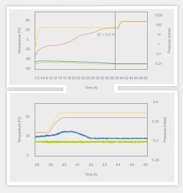 另,下圖中的頂部線顯示 37 小時后到達終點。此時,溫度曲線和壓力曲線在循環(huán)轉(zhuǎn)換為二級干燥之前同時合并。