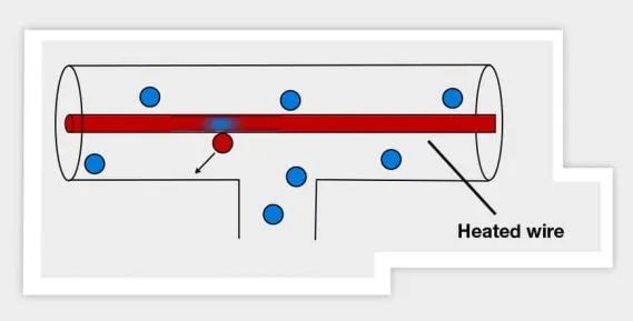 該技術(shù)使用兩種不同的壓力計,一個皮拉尼傳感器和一個電容壓力計。皮拉尼傳感器的工作原理是氣體的熱導(dǎo)率隨壓力變化。壓力計用一根細導(dǎo)線懸掛在氣體中,用電流加熱來測量壓力。在高壓下,由于周圍氣體分子與金屬絲的高碰撞率,金屬絲將熱能損失給氣體。這一原理如下圖所示。