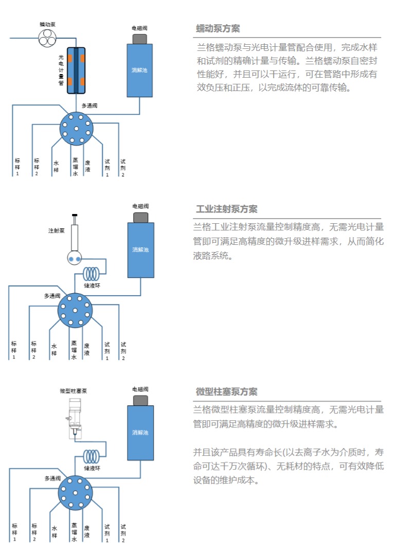 在在線水質檢測系統(tǒng)中,蘭格產(chǎn)品主要用于傳輸待檢測水樣,以及各種檢測試劑。蘭格可提供不同種類的精密泵解決方案:蠕動泵、工業(yè)注射泵和微型柱塞泵,以滿足不同檢測系統(tǒng)的需求。