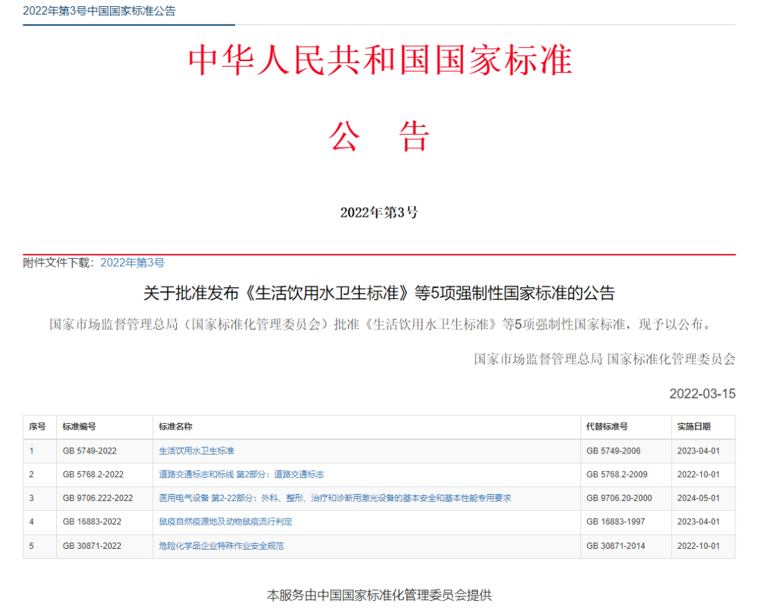 2022年3月15日,國家市場監(jiān)督管理總局(國家標(biāo)準(zhǔn)化管理委員會)批準(zhǔn)《生活飲用水衛(wèi)生標(biāo)準(zhǔn)》等5項強制性國家標(biāo)準(zhǔn)。