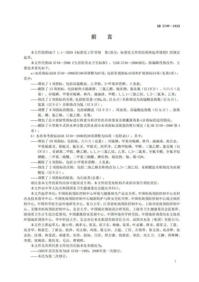 而 GB 5749-2022 標(biāo)準(zhǔn)的起草單位在原有中國疾病預(yù)防控制中心環(huán)境與健康相關(guān)產(chǎn)品安全所的基礎(chǔ)上新增了18加專業(yè)單位,這也就意味著標(biāo)準(zhǔn)內(nèi)容的制定更加全面、更加嚴(yán)格、更加權(quán)威。