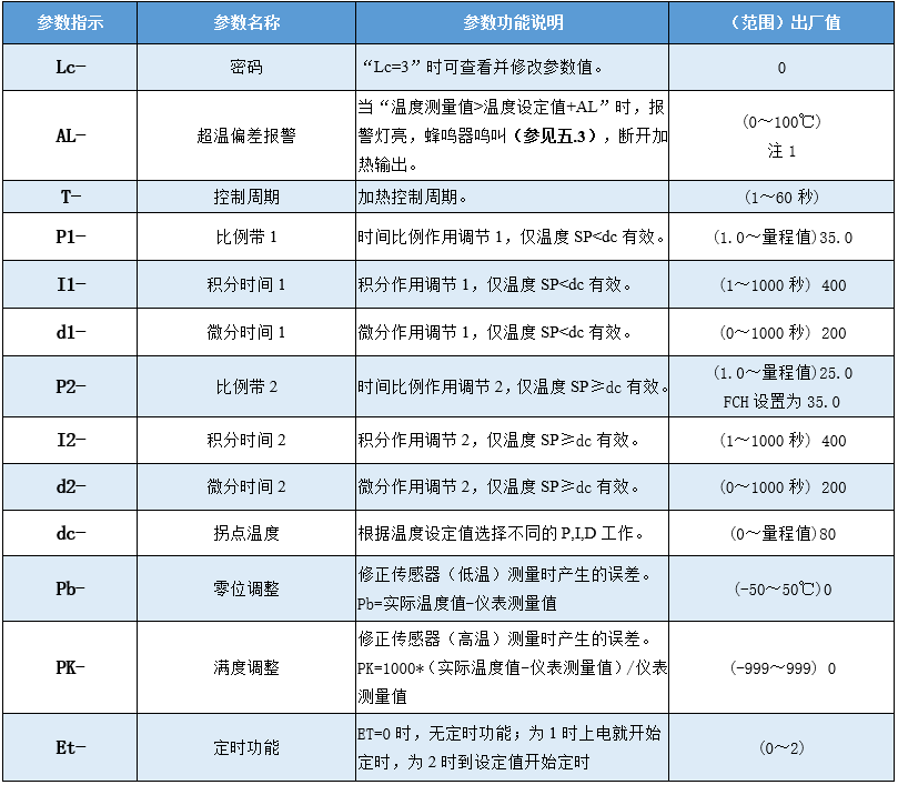 再點(diǎn)擊設(shè)定鍵,若密碼值不正確,控制器自動返回到正常顯示狀態(tài),若密碼值正確,則進(jìn)入到溫度內(nèi)部參數(shù)設(shè)定狀態(tài),再點(diǎn)擊設(shè)定鍵可以依次修改各個參數(shù)。